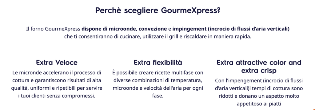 Con il forno professionale compatto ad alta velocitร GourmeXpress potrai servire pietanze deliziose in maniera facile e veloce. Dal trattamento delle proteine alla perfetta fusione del formaggio e doratura degli alimenti, grazie a una combinazione di tre metodi di riscaldamento. Questa soluzione faciliterร il tuo lavoro e ti permetterร di ampliare il menรน. Potrai servire ai tuoi clienti piatti di alta qualitร in modo costante e facilmente ripetibile con un semplice tocco.